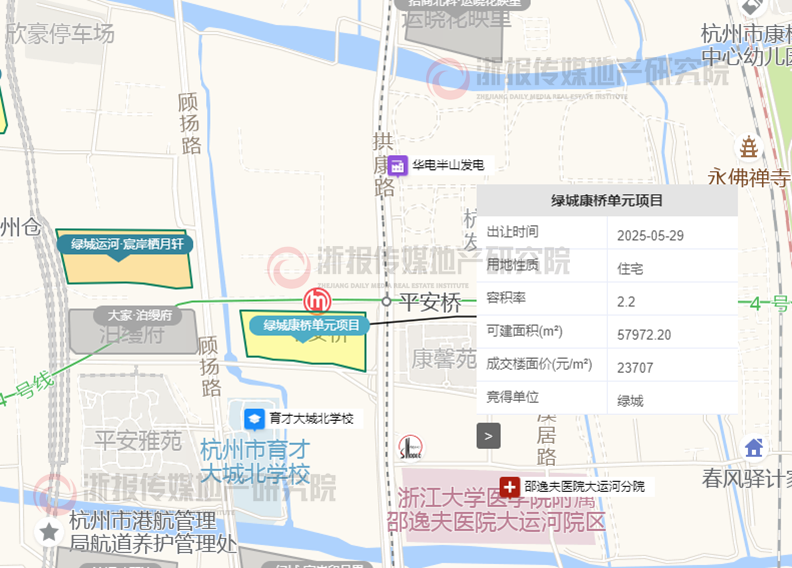 2025年5月29日,杭州浙群置业有限公司(绿城)以137433万元竞得康桥单元GS120201-07地块,楼面价为23707元/㎡,溢价率为40.3%。
