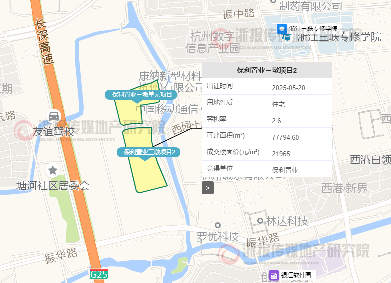 2025年5月20日,浙江保利置业有限公司(保利置业)以170879万元竞得三墩单元XH010401-24地块,楼面价为21965元/㎡,溢价率为51.4%。