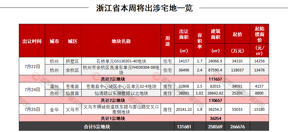 住在杭州网7月21日讯(记者 岑天宇) 据浙报传媒地产研究院追踪统计,本周 (7.21-7.27)浙江省拟出让涉宅地5宗(剔除纯租赁、纯安置,出让面积小于1000㎡的涉宅地,下同),体量25.8万㎡,总起价26.7亿元,平均起始楼面价11174元/㎡。