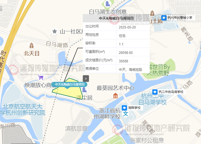 杭政储出[2025]59号地块即为中天&海威白马湖项目,项目规划11幢4F联排和3幢5F叠排。公示时间为2025年7月26日到2025年8月5日。建设单位为杭州美滨房地产开发有限公司。