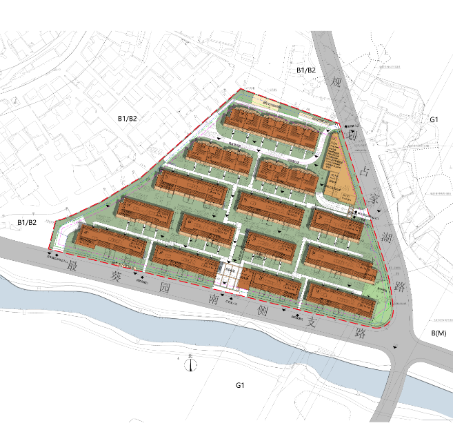 地块总用地面积23726m²,总建筑面积51316.60m²,其中地上建筑面积27222.30m²,地上计容建筑面积26098.30m²,地上不计容建筑面积1124m²,地下建筑面积24094.30m²,建筑密度32%,容积率1.10,绿地率30%。根据公示,项目规划11幢4F联排和3幢5F叠排。