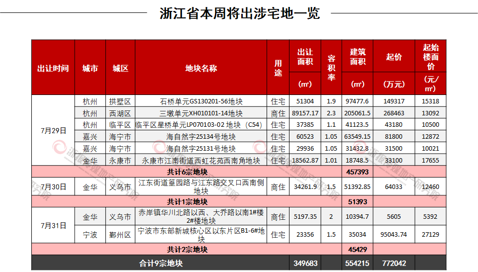 住在杭州网7月28日讯(记者 岑天宇) 据浙报传媒地产研究院追踪统计,本周 (7.28-8.3)浙江省拟出让涉宅地9宗(剔除纯租赁、纯安置,出让面积小于1000㎡的涉宅地,下同),体量55.4万㎡,总起价77.2亿元,平均起始楼面价13827元/㎡。
