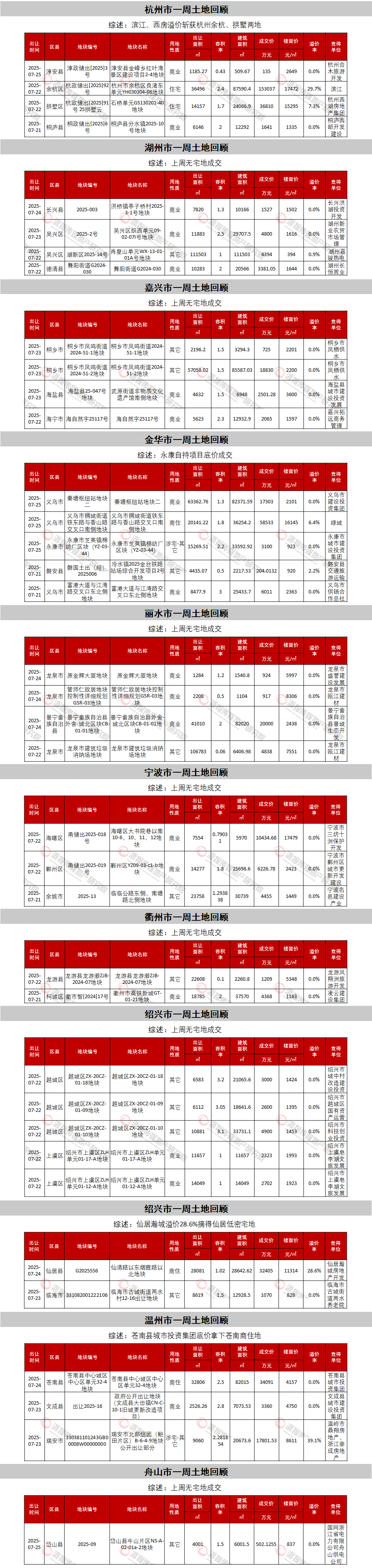 全省方面,溢价也相当客观:仙居瀚城房地产开发溢价28.6%竞得台州仙居低密宅地;绿城16145元/㎡斩获金华义乌地块;苍南县城市投资集团底价拿下温州苍南商住地。