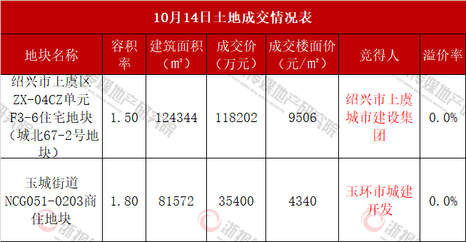 住在杭州网10月14日讯(记者 岑天宇)14日,绍兴上虞区、台州玉环市共计2宗地块出让。最终两宗宅地全部底价成交,竞得方均为地方城建,分别为绍兴市上虞城市建设集团有限公司和玉环市城建开发有限公司。