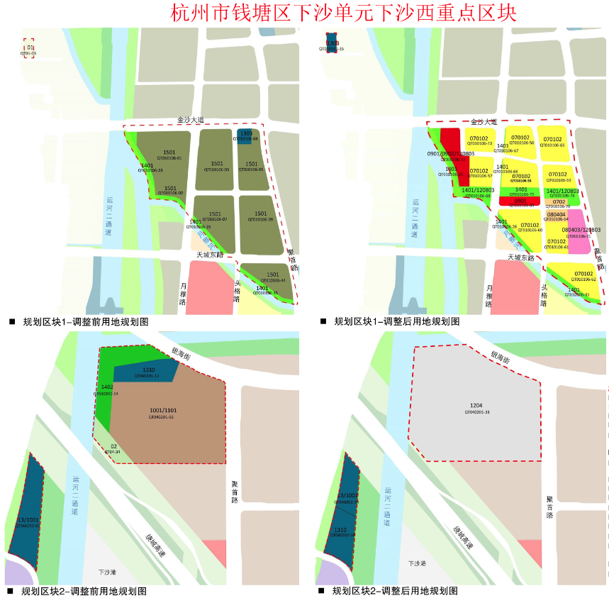规划区块1-北至下沙大道南至海通街,西至运河二通道-月雅河,东至聚首路,位于金沙湖板块的下沙西单元内,距离轨道交通1号线下沙西站约1公里,东侧不远处便是金沙湖公园。调整后,该区块新增二类城镇住宅用地9宗,总用地面积271.2亩,按照地块标注的容积率测算,预计未来增加住宅建面约41.397万㎡。