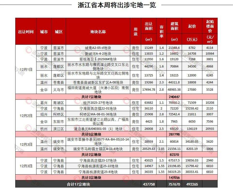 住在杭州网12月1日讯(记者 岑天宇)据浙报传媒地产研究院追踪统计,本周(12.1-12.7)浙江省拟出让涉宅地17宗(剔除纯租赁、纯安置,出让面积小于1000㎡的涉宅地,下同),体量76万㎡,总起价49亿元,平均起始楼面价6394元/㎡。