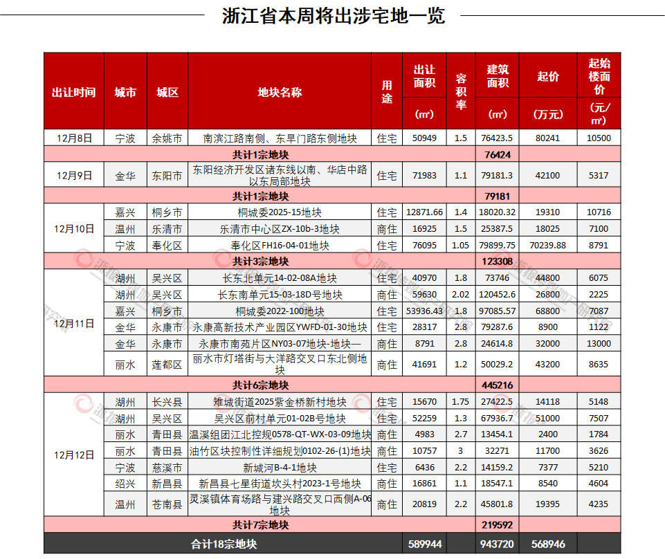 住在杭州网12月8日讯(记者 岑天宇) 据浙报传媒地产研究院追踪统计,本周(12.8-12.14)浙江省拟出让涉宅地18宗(剔除纯租赁、纯安置,出让面积小于1000㎡的涉宅地,下同),体量94万㎡,总起价57亿元,平均起始楼面价6260元/㎡。