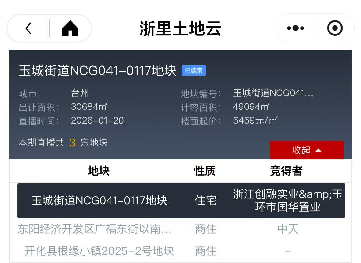 浙江创融实业&玉环市国华置业溢价13.4%竞得台州玉环宅地