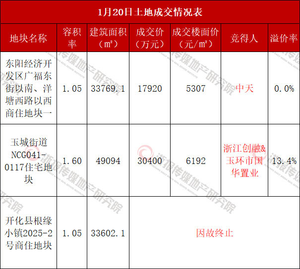 住在杭州网1月20日讯(记者 岑天宇)今日,金华东阳市、台州玉环市和衢州开化县共计3宗地块出让。最终,中天17920万元底价摘得金华东阳地块;浙江创融实业&玉环市国华置业溢价13.4%竞得台州玉环宅地;衢州开化商住地因故终止出让。