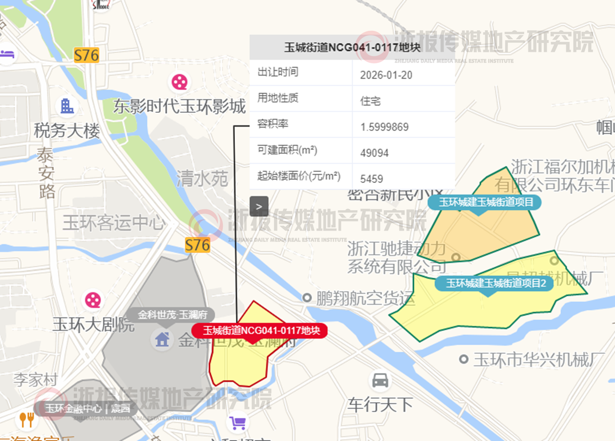 玉城街道NCG041-0117地块用地面积30684㎡,容积率1.6,建筑面积49094㎡。最终经过37轮报价,由浙江创融实业&玉环市国华置业以30400万元总价竞得,楼面价6192元/㎡,溢价率13.4%。