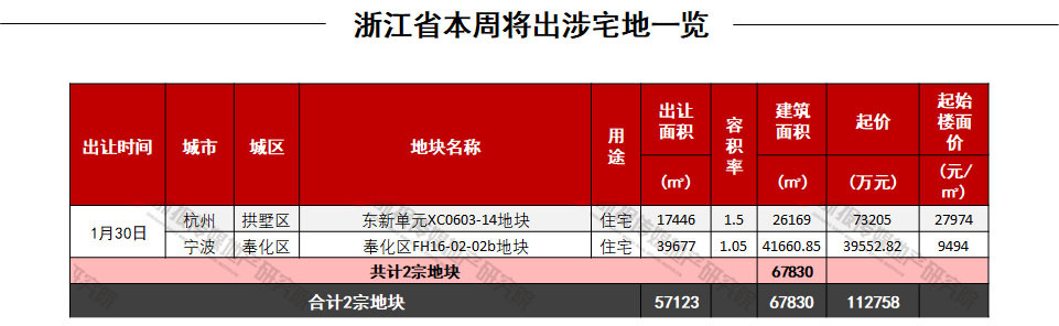 住在杭州网1月26日讯(记者 岑天宇)据浙报传媒地产研究院追踪统计,本周(1.26-2.1)浙江省拟出让涉宅地2宗(剔除纯租赁、纯安置,出让面积小于1000㎡的涉宅地,下同),体量6.8万㎡,总起价11.3亿元,平均起始楼面价18734元/㎡。