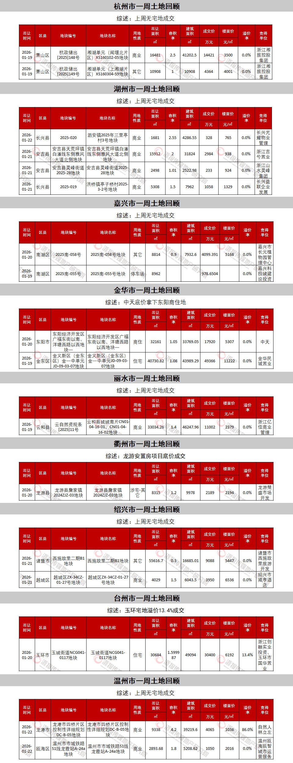 3宗宅地均由民企竞得:中天底价竞得金华东阳商住地;金华民诚置业4.9亿元摘得金华金东宅地;浙江创融实业投资&玉环市国华置业联合底价摘得台州玉环地块。