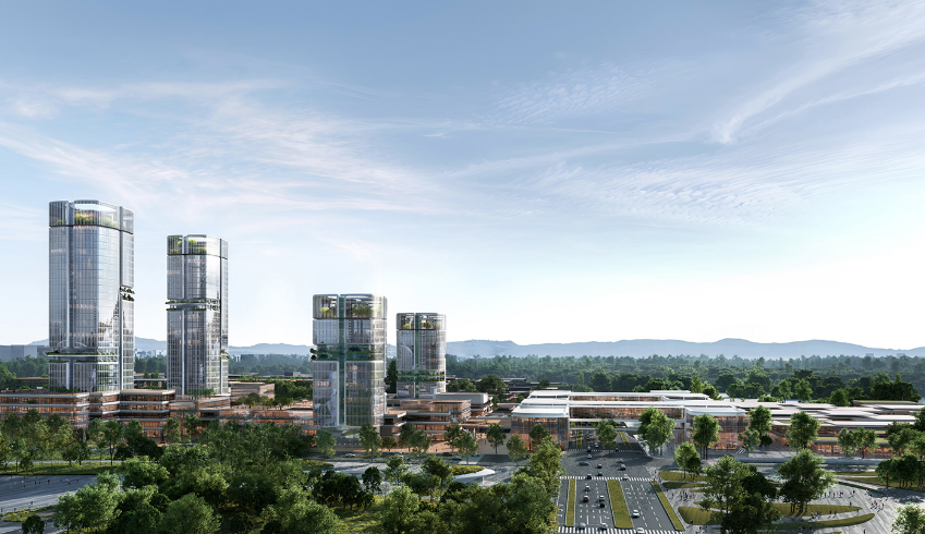 项目设计团队10 Design以杭州山水为启发,塑造“流水盈光”概念,打造了一个活力环绕、流光溢彩的“城市客厅”,项目将串联起周边的产业园区、科企总部、城市枢纽、品质社区、零售消费、公共设施及滨水空间,打造区域超级枢纽与公共活力中心。