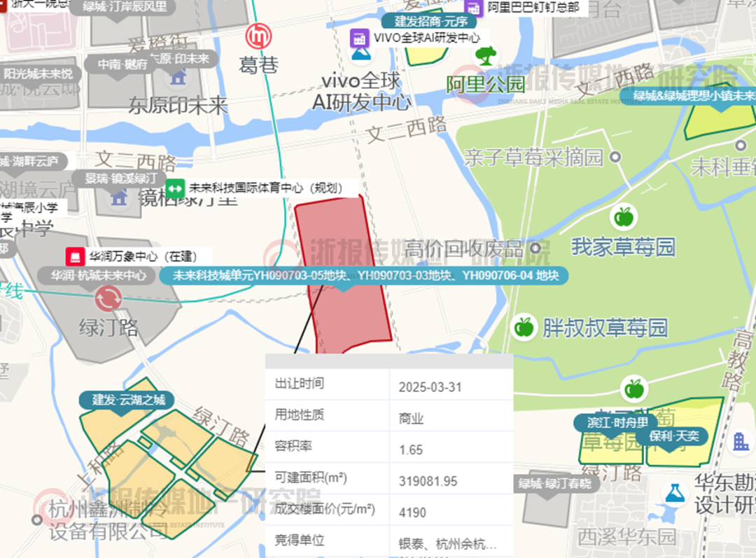 2025年3月31日,杭州银悦置业有限公司(银泰&杭州余杭城市发展投资集团)以总价133688万元竞得未来科技城单元YH090703-05地块、YH090703-03地块、YH090706-04 地块,成交楼面价为4190元/㎡,溢价率0%。