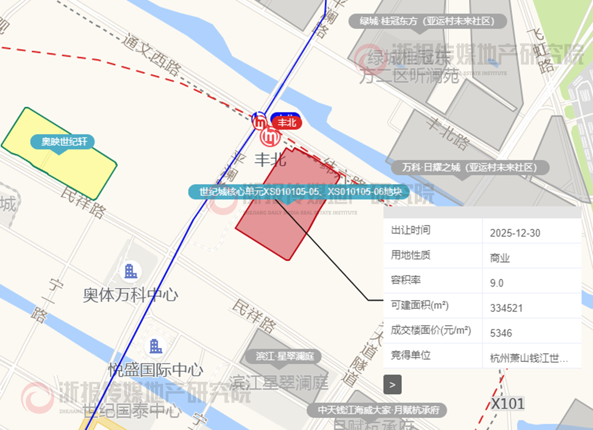 2025年12月30日,杭州世纪智启项目管理有限公司以总价178825万元底价竞得世纪城核心单元XS010105-05、XS010105-06地块,成交楼面价5346元/㎡,溢价率0.0%。