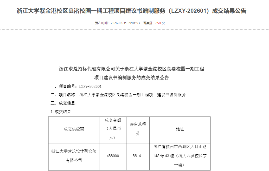 住在杭州网4月1日讯(记者 岑天宇)3月31日,浙江大学采购网发布了浙江大学紫金港校区良渚校园一期工程项目建议书编制服务(LZXY-202601)成交结果公告。