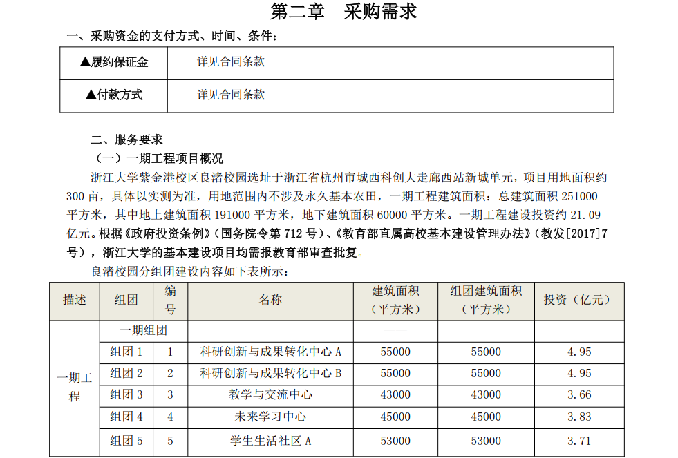 附件中显示,浙江大学紫金港校区良渚校园选址于浙江省杭州市城西科创大走廊西站新城单元,项目用地面积约300亩,具体以实测为准,用地范围内不涉及永久基本农田,一期工程总建筑面积251000㎡,其中地上建筑面积191000㎡,地下建筑面积60000㎡。一期工程建设投资约21.09亿元。