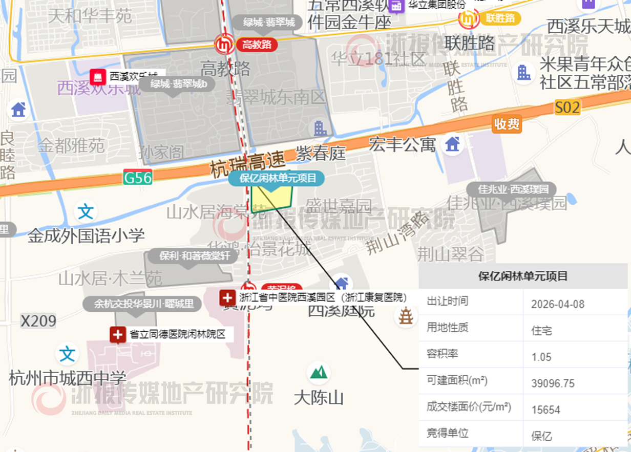 2026年4月8日,杭州保亿亿航商业控股有限公司(保亿)以总价61201万元底价竞得闲林单元YH120201-01地块,成交楼面价15654元/㎡,溢价率21.9%。
