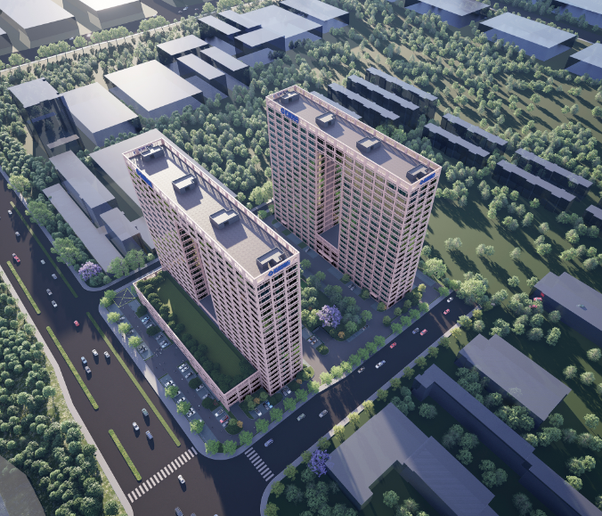 两幢高层中间镂空,外部由玫瑰金格栅、中空Low-E玻璃、玫瑰金铝板组成,建筑高度均为96.5米。项目中心还规划有中心花园。
