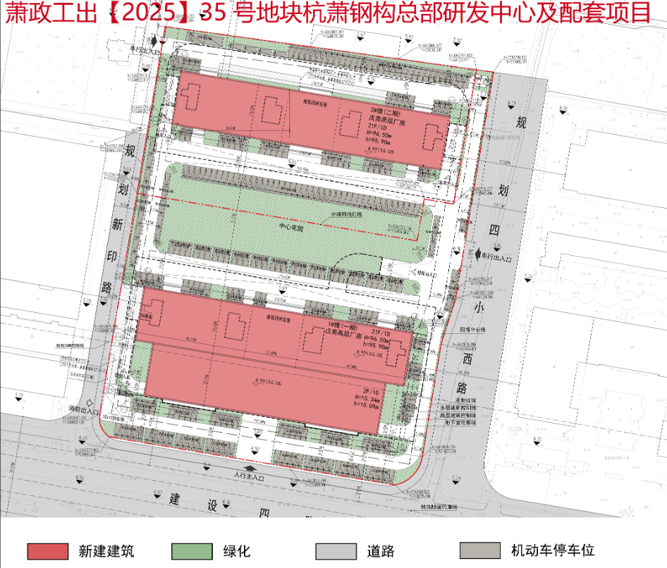 萧政工出【2025】35号地块即为杭萧钢构总部研发中心及配套项目,根据公示,项目规划2幢21F戊类高层厂房,以及2F附属用房。