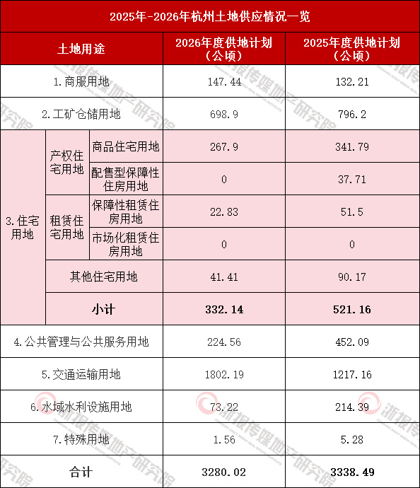 从总计划供应看,对比2025年度的3338.49公顷,下降58.47公顷。其中住宅用地供应下降36%,市区住宅供应下降39%(2025市区住宅计划供应517.32公顷),商品住宅供应下降22%,商业用地供应上升约12%。