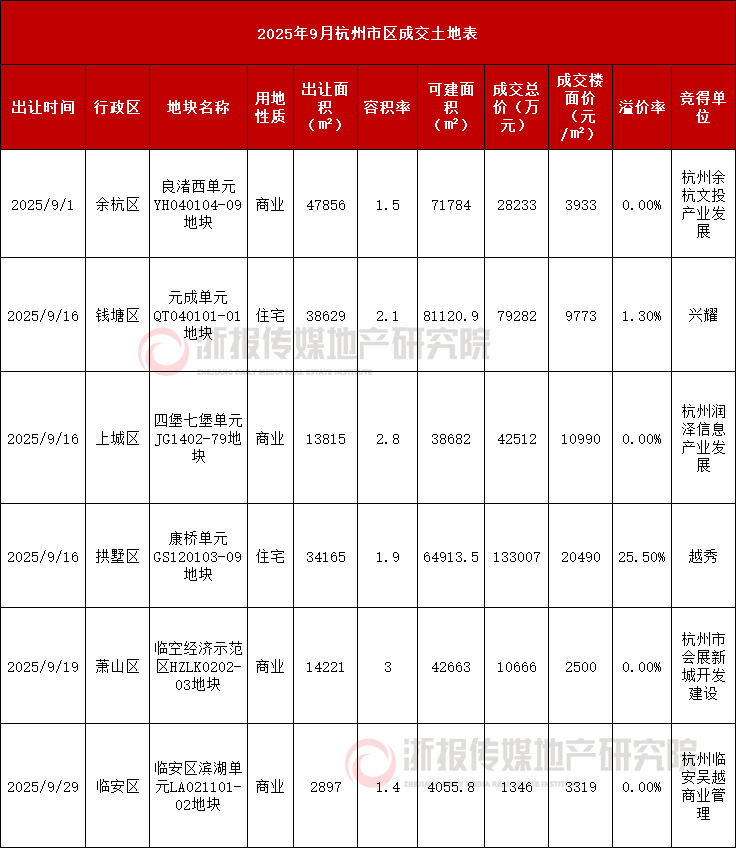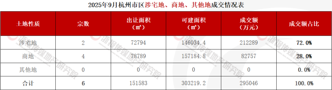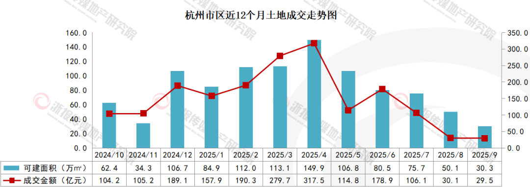 2025年9月,杭州市区共成交6宗地块,出让面积15.2万㎡(约227亩),总建筑面积30.3万㎡,成交金额29.5亿元。