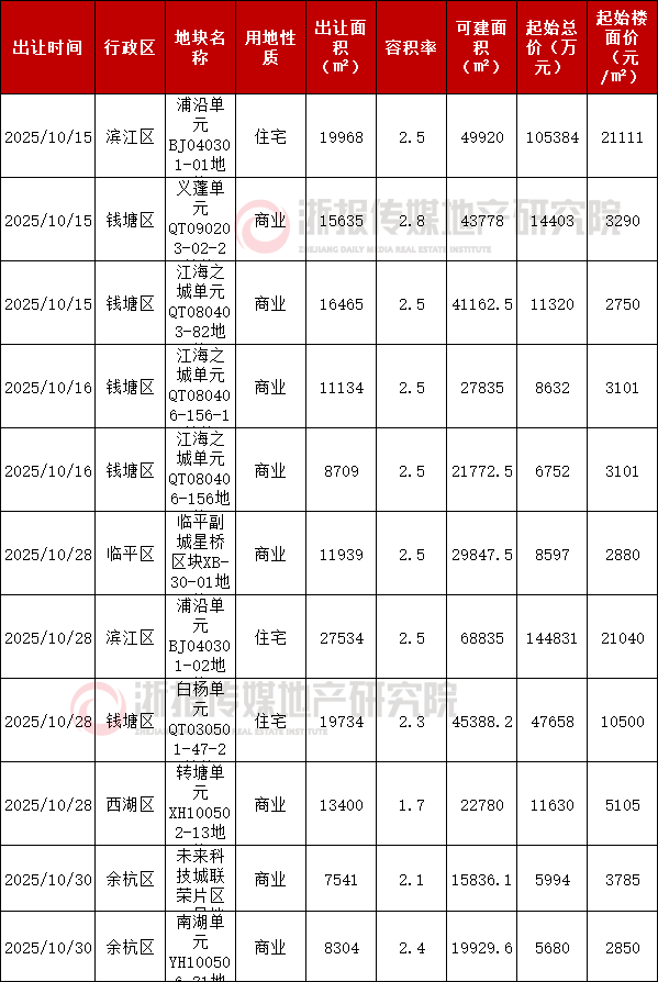 2025年10月,杭州市区预计出让11宗土地,总出让面积16.0万㎡,建筑面积38.7万㎡,起始总价37.1亿元。其中涉宅用地预计出让2场,共3宗,出让面积6.7万㎡,建筑面积16.4万㎡,起始总价29.8亿元。