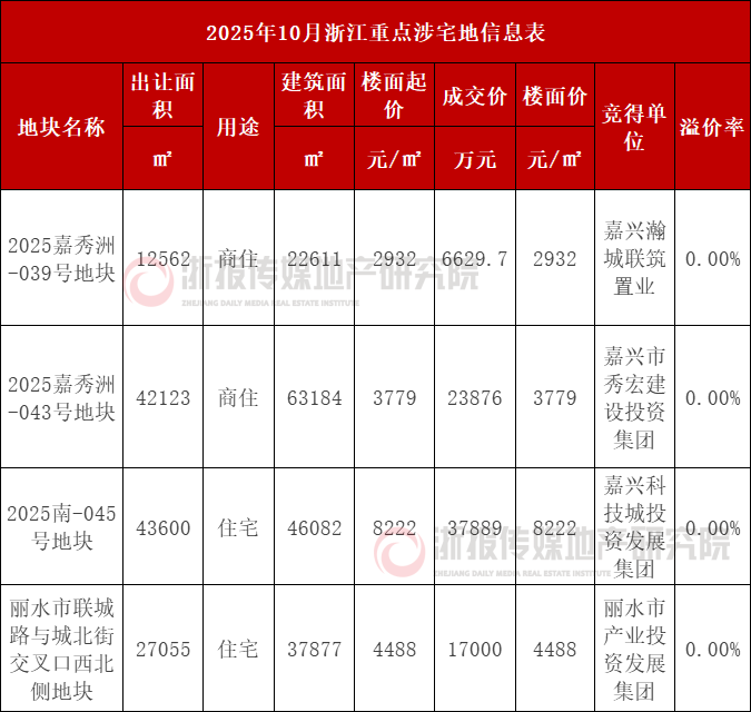 住在杭州网10月21日讯(记者 马梦婷)今日,嘉兴三宗、丽水一宗涉宅地同日出让。最终四宗地块均底价成交,且均为各自本土企业竞得。