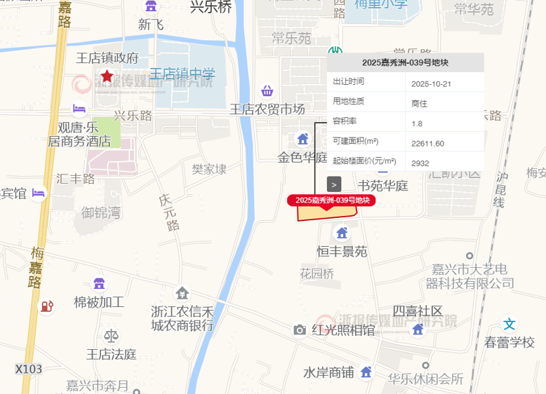 王店镇商住地一轮底价成交,由嘉兴瀚城联筑置业以6629.72万元总价竞得,楼面价2932元/㎡。地块商业建筑面积占比小于建筑计容面积的10%,商业用地面积占比小于地上总用地面积的10%。板块内当前无其他储备项目。