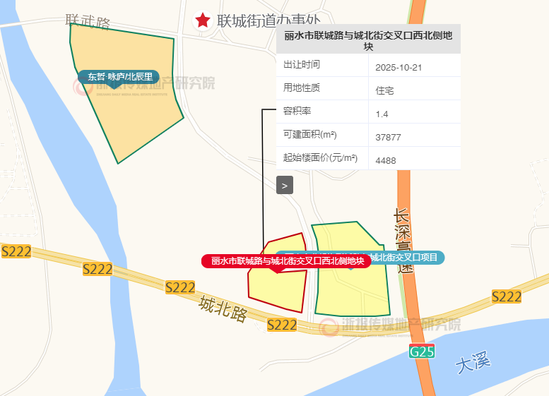 丽水市联城路与城北街交叉口西北侧地块一轮底价成交,由丽水市产业投资发展集团以17000万元总价竞得,楼面价4488元/㎡。