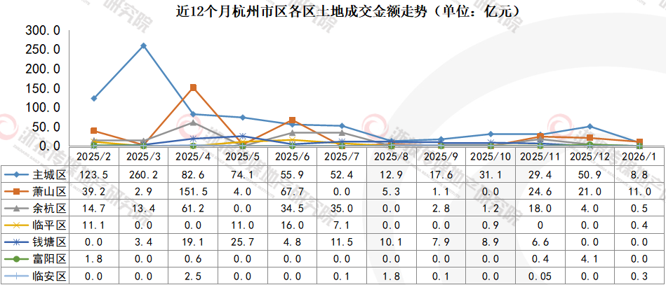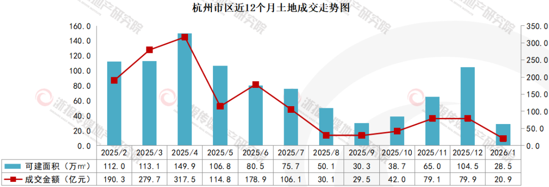 2026年1月,杭州市区共成交9宗地块,出让面积13.3万㎡(约199亩),总建筑面积28.5万㎡,成交金额20.9亿元。