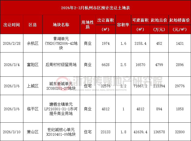 2026年2月,杭州市区预计出让1宗土地,总出让面积0.2万㎡,建筑面积0.3万㎡,起始总价0.05亿元,无涉宅地出让。2026年3月,杭州市区预计出让4宗土地,总出让面积6.7万㎡,建筑面积13.5万㎡,起始总价35.6亿元。其中涉宅用地预计出让2场,共2宗,出让面积5.6万㎡,建筑面积11.3万㎡,起始总价35.0亿元。