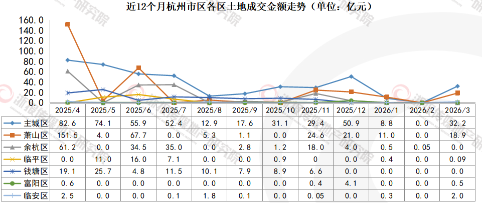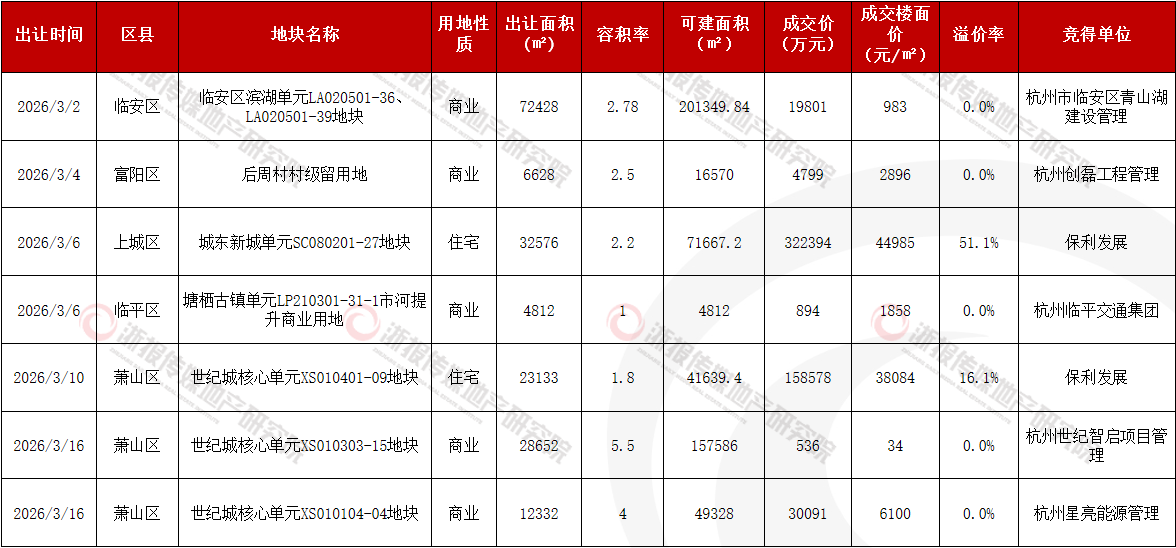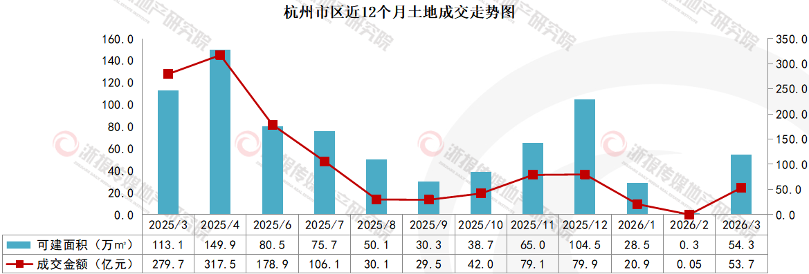 2026年3月,杭州市区共成交7宗地块,出让面积18.1万㎡(约271亩),总建筑面积54.3万㎡,成交金额53.7亿元。