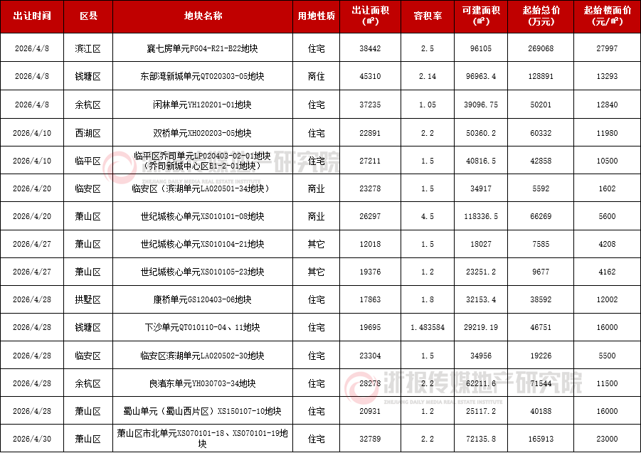 2026年4月杭州市区出让地块汇总