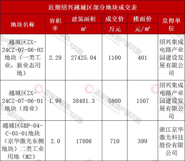 越城区ZX-24CZ-07-06-01地块占地面积19435平方米,容积率为1.78-1.98,用地性质为商业用地,成交价5800万元;越城区ZX-24CZ-07-06-02地块占地面积11976平方米,容积率在2.1-2.29,用地性质一类工业用地(工业新业态用地M0),成交价1100万元。