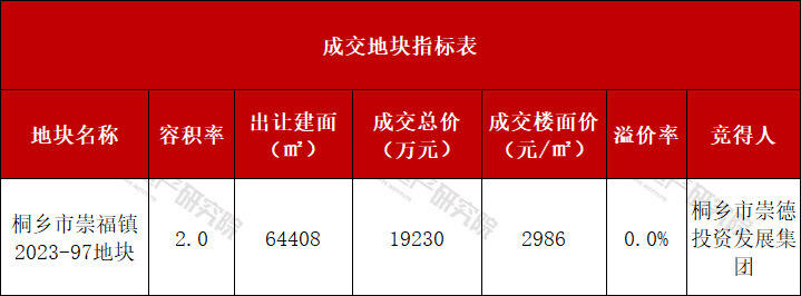 从成交结果来看,地块仅经过一轮竞价,由桐乡市崇德投资发展集团底价竞得,成交总价19230万元,成交楼面价2986元/㎡。