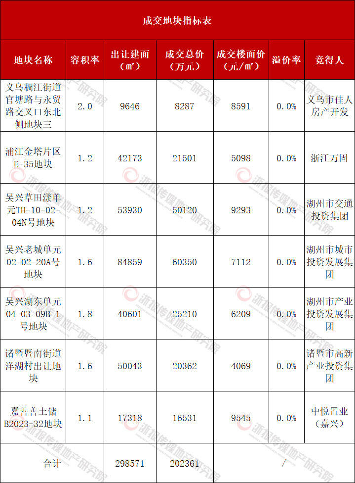 全省七宗地块均底价成交,嘉善义乌浦江地块由民企竞得