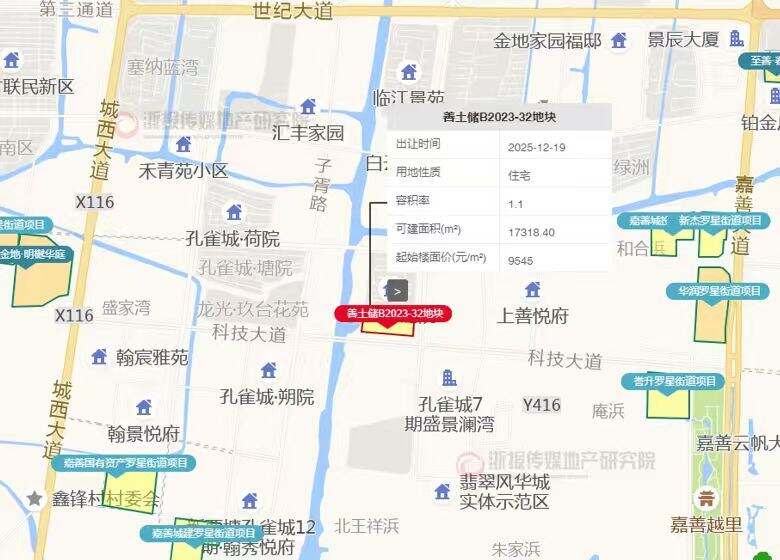嘉兴嘉善县善土储B2023-32地块由中悦置业(嘉兴)以16531.2万元底价竞得,楼面价9545元/㎡。