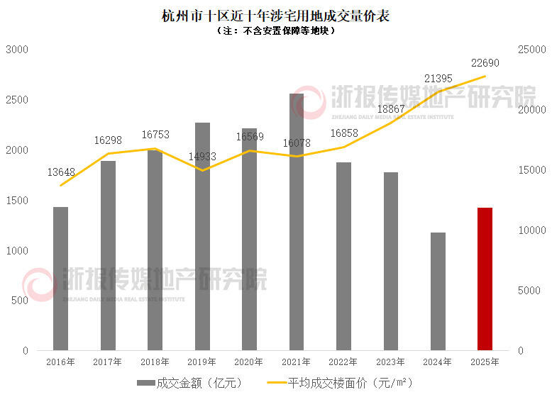 截至该地块成交,2025年杭州宅地出让数据完整出炉:2025年杭州市区(市十区)涉宅地块出让金数额达到1420.8亿元,较去年同比增长21.5%,但其成交金额在长时间段来看仍处相对低位,自2016年以来的近十年间,2025年宅地成交金额仅高于2024年;由于地块中心化、低密化,整体的平均楼面价达到22690元/㎡,较去年同比增长6.1%,平均楼面价达到历史高点。