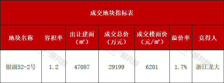 住在杭州网12月23日讯(记者 俞东辉)今日,杭州成交本年度最后一宗涉宅地:位于富阳区银湖板块,邻近杭州野生动物园。地块仅经过两轮报价,就由浙江龙大地产收入囊中。成交总价29199万元,折合成交楼面价6201元/㎡,溢价率1.7%。