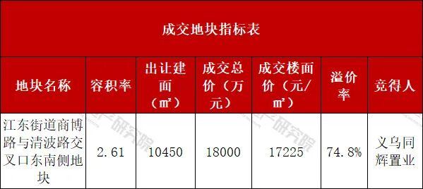 从成交结果来看,江东地块经过63轮竞价,最终由义乌同辉置业以18000万元总价竞得,折合成交楼面价17225元/㎡,溢价率达到74.8%。