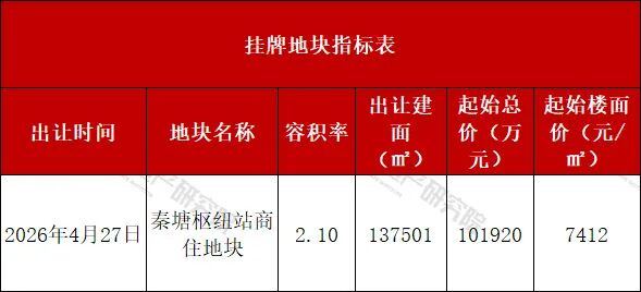 秦塘枢纽站商住地块出让面积65476.8㎡,容积率2.1,可建面积137501.28㎡。地块起始总价101920万元,折合起始楼面价7412元/㎡。