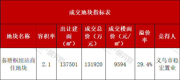 从成交结果来看,成交地块经过31轮竞价,最终由义乌市稳宏置业以131920万元总价竞得,折合成交楼面价9594元/㎡,溢价率29.4%。