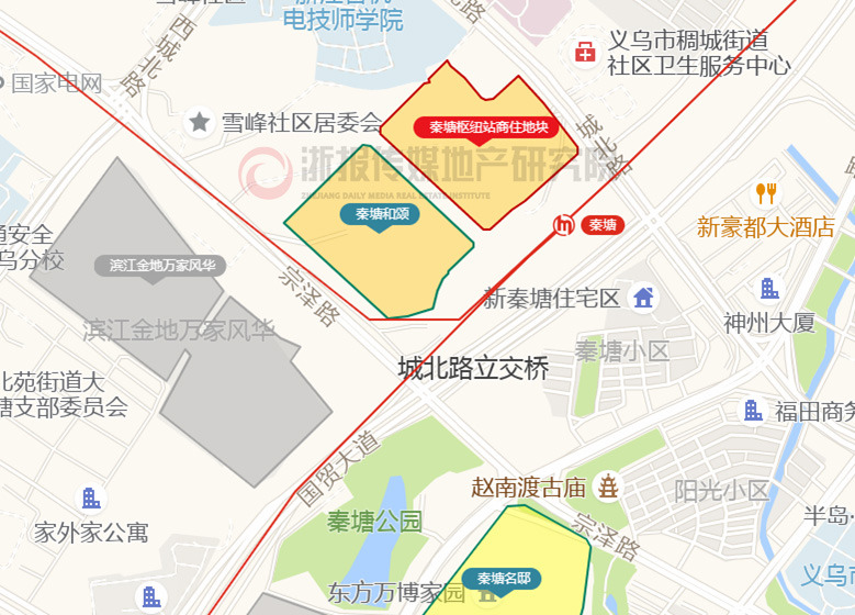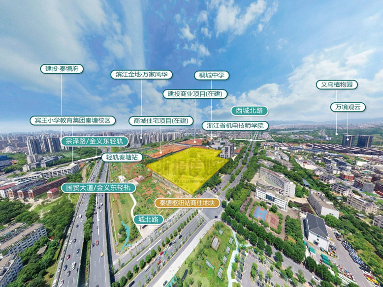 同时,地块东南侧的国贸大道也是义乌南北向交通大动脉、城市快速路网核心 “一纵”。 与西侧的秦塘站形成 “快速路 + 轨道交通” 双核心交通节点,赋能板块能级跃升。