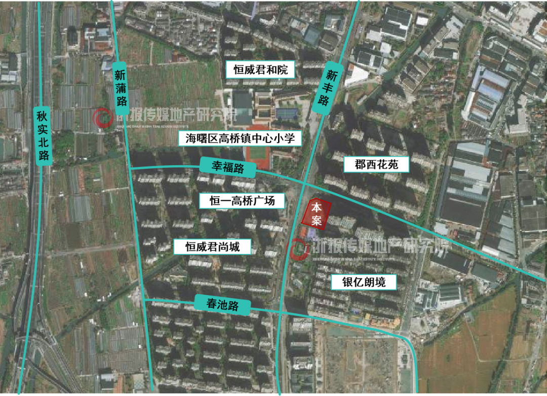 此次挂牌商地位于恒一高桥广场东侧。地块周边住宅小区密集,涵盖银亿朗境、恒威君尚城、郡西花苑等,形成了浓郁的居住氛围。值得注意的是,地块西北角即为海曙区高桥镇中心小学,潜在商业需求显著,此外根据既往区域规划公示,地块南侧毗邻一处规划公园。