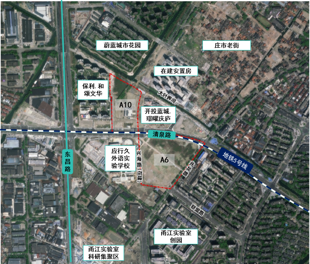 2宗地块位置位于甬江实验室A区,紧邻地铁5号线(3号线二期段)兴海南路站,图示如下: