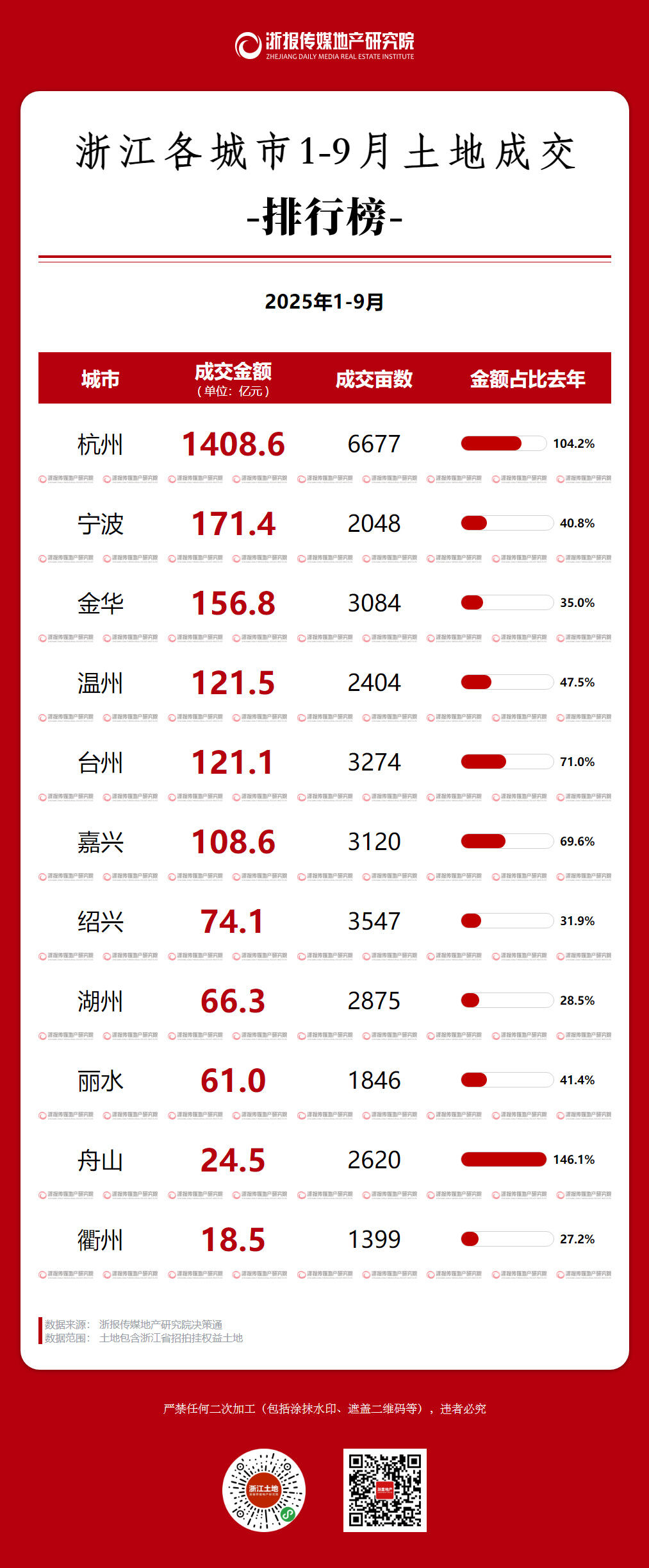 住在杭州网10月1日讯(记者 郑青青)2025年1-9月,浙江省全省共成交929宗土地,其中涉宅地239宗(剔除纯租赁、纯安置、出让面积小于1000㎡的涉宅地,下同),总建面1442.0万㎡,总出让金1917.5亿元,平均楼面价13298元/㎡,平均溢价率23.4%。