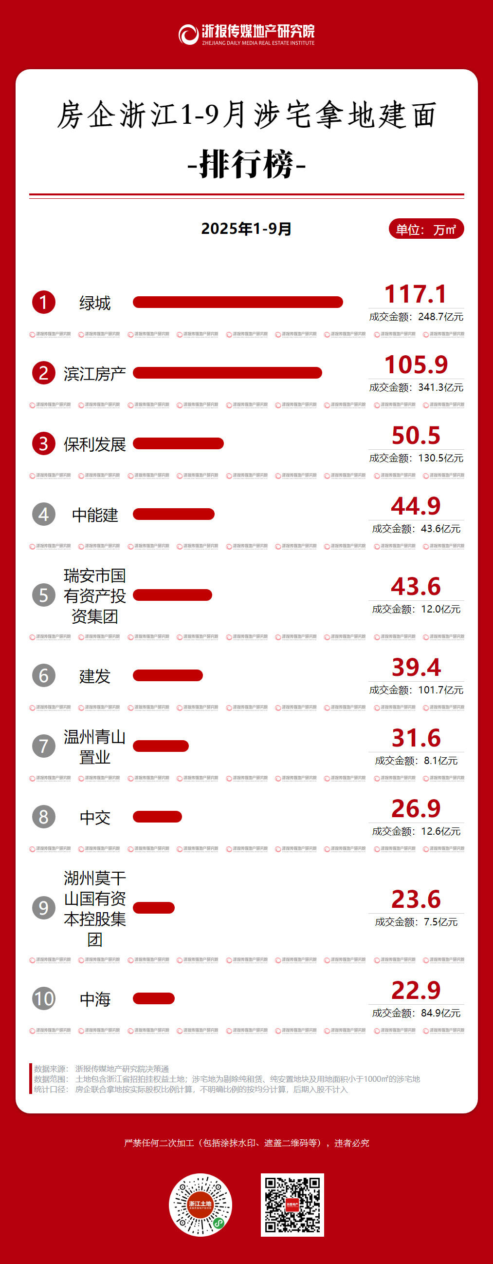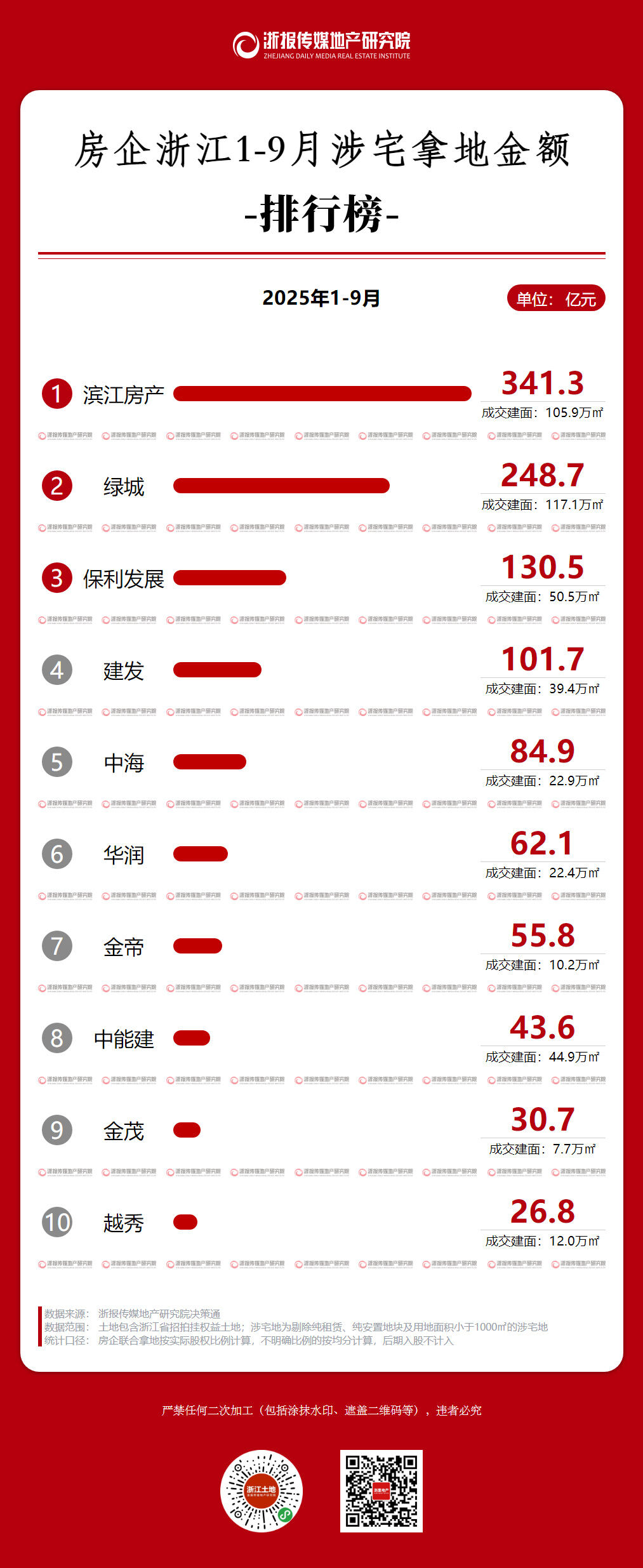 房企方面,前三季度浙江省涉宅地拿地金额TOP9的企业名单与1-8月保持一致,且对应拿地金额未发生变动,反映出在当前市场低位运行的背景下,头部房企普遍采取理性、审慎的投资策略。