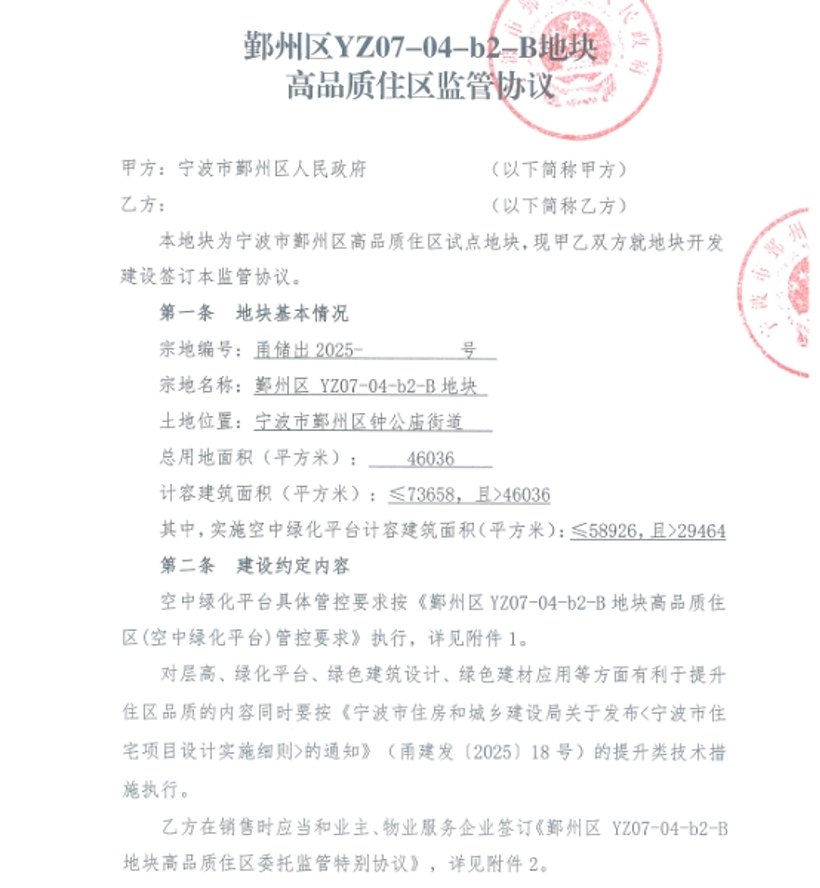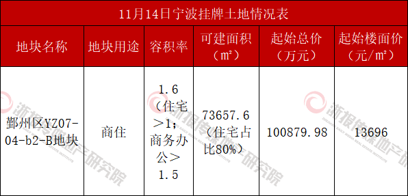 此次挂牌的鄞州区YZ07-04-b2-B地块,出让面积46036㎡,综合容积率1.6(居住部分大于1.0,商务办公大于1.5),总体量73657.6㎡,其中住宅计容建面占比80%(约58926㎡),配套商业建面3500-3600㎡。