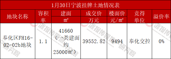 住在杭州网1月30日讯(记者 郑青青 通讯员 万雪丽)今日,宁波市本级2026年度首宗住宅用地出让,奉化区FH16-02-02b地块,由宁波奉化元璟置业有限公司(奉化交控)以总价39552.82万元竞得,成交楼面价约9494元/㎡。
